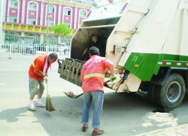 8月4日下午2時(shí)許,記者在朝陽路碰見了一輛垃圾壓縮車的司機(jī)于志學(xué)及環(huán)衛(wèi)工人韓世翠和周遵忠,他們正在將三個(gè)垃圾桶的垃圾倒在垃圾壓縮車?yán)铩T谘籽琢胰障?,垃圾桶?nèi)的垃圾不時(shí)散發(fā)出陣陣異味,韓世翠和周遵忠從容地將路旁一桶桶垃圾掛上車鉤,倒入垃圾壓縮車中。壓縮車將垃圾倒在垃圾車內(nèi)后,韓世翠和周遵忠又迅速地將垃圾桶歸原位。還有垃圾落在路上以及垃圾桶邊的垃圾,他倆也負(fù)責(zé)將其打掃完畢。
