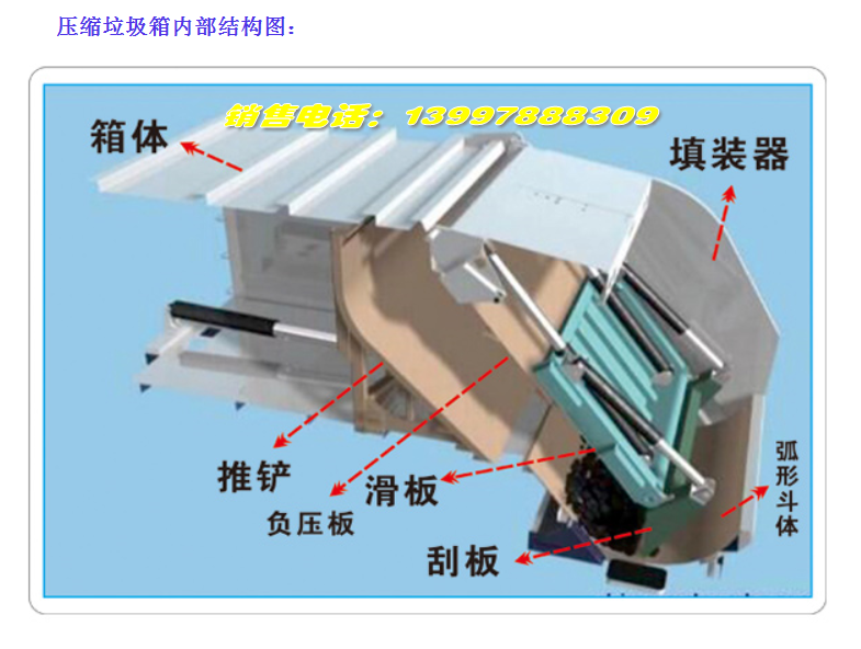 裝垃圾:壓縮垃圾車(chē)通過(guò)液壓翻轉(zhuǎn)機(jī)構(gòu)將垃圾裝人填裝器內(nèi),操作刮板,滑板沿弧型斗體將垃圾刮起,使用負(fù)壓將垃圾推進(jìn)垃圾箱內(nèi)。
