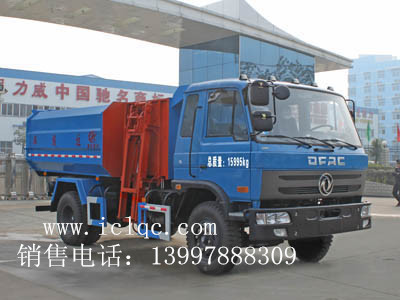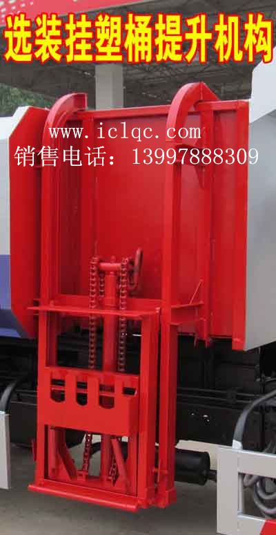 環(huán)衛(wèi)垃圾車東風145掛桶式垃圾車自裝料裝置:自裝料裝置設在箱體的前部側面,由支架、油缸、鏈條結構、吊鉤等組成。此裝置可將外部垃圾桶內的垃圾提升裝入箱體內。