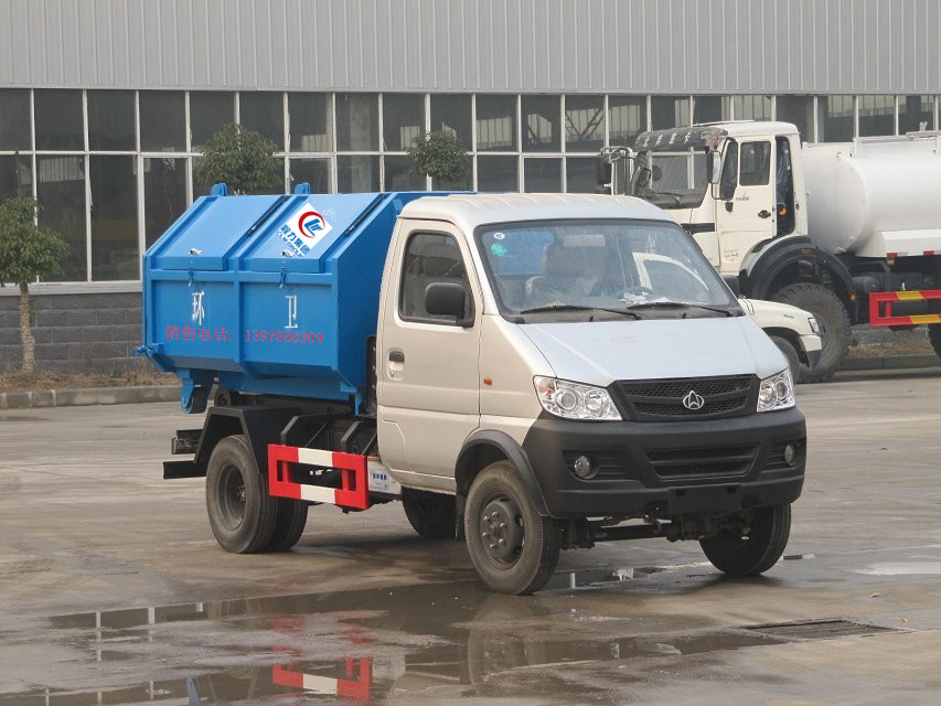 該車采用高新設(shè)計(jì)可擺動(dòng)的鉤臂,垃圾箱由框架、開(kāi)啟油缸、滑輪、后門(mén)和若干加強(qiáng)框架與鋼板焊接而成。調(diào)換貨廂快捷方便,貨廂上帶蓋(倒垃圾時(shí)可翻開(kāi)),垃圾車廂體可選用碳鋼、不銹鋼材質(zhì)、內(nèi)部采取環(huán)氧樹(shù)脂防腐處理,改裝部分與原車底盤(pán)為可分離式,維修方便且保持了原車的機(jī)動(dòng)性及行駛性能。該車結(jié)構(gòu)簡(jiǎn)單,操作穩(wěn)定方便,裝卸效率高,機(jī)械化程度高,并使機(jī)構(gòu)最為省力。