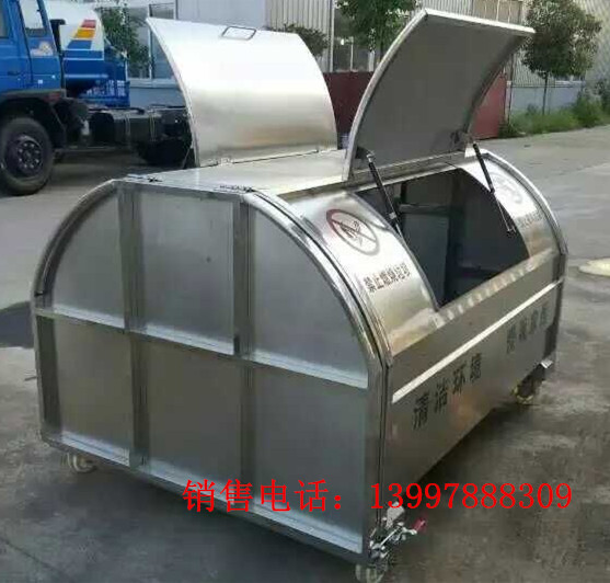 304不銹鋼,邊板:1.5mm,底板2mm,帶啟動(dòng)撐桿,尾部密封條鎖緊,4個(gè)萬(wàn)向腳輪,2個(gè)滑道及鉤柄采用優(yōu)質(zhì)槽鋼,其他為不銹鋼。垃圾箱體外形尺寸1.94米長(zhǎng)x1.4寬x0.98米高。