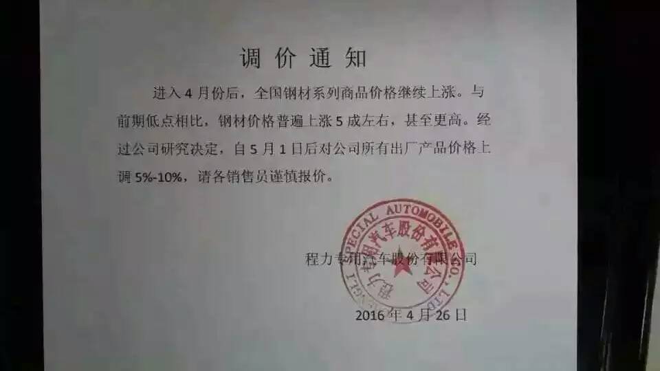 自5月1號過后,鋼材價格普遍上調(diào)價格,鋼材價格上調(diào)直接影響著汽車價格的上漲。湖北隨州程力專用汽車有限公司“慶五一,程力公司從廣大消費者的利益出發(fā),暫且按出廠價賣出所有車型”還剩下不到一個星期,想訂車的朋友敢緊訂車,訂車電話:13997888309。