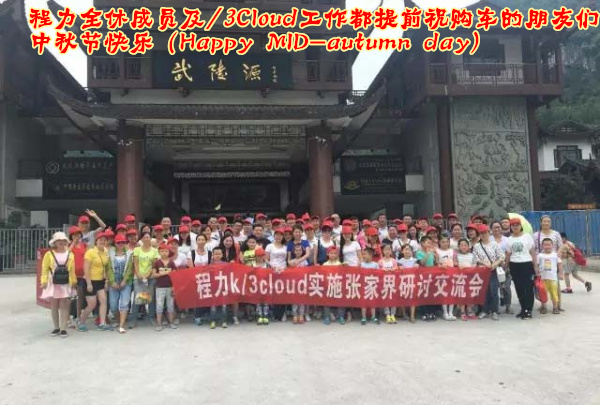 祝賀“程力公司在8月和即將來(lái)臨的中秋節(jié)喜獲大封收”——2016年8月26至28日,由程力集團(tuán)公司總經(jīng)理程阿羅帶隊(duì)部分副總經(jīng)理及參加金蝶K/3cloud部分實(shí)施人員一行70余人赴張家界研討交流。同時(shí),對(duì)于即將到來(lái)的中秋節(jié),程力全體員工及/3Cloud的成員提前祝大家各秋節(jié)快樂(Happy Mid/autumn day )