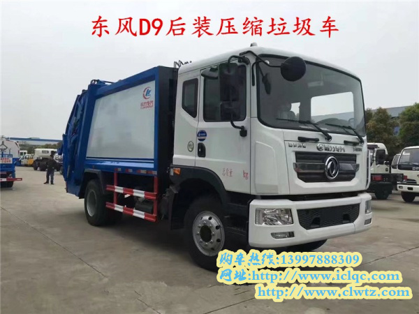 三、東風(fēng)D9后裝壓縮垃圾車,整車型號為CLW5181ZYSE5,底盤型號EQ1181LJ9BDE,總質(zhì)量18噸,額定質(zhì)量8.1噸,整備質(zhì)量9.7噸,4500mm軸距,康明斯210馬力國五發(fā)動,10.00R20鋼絲胎。該款壓縮垃圾車的容積為10噸,后垃圾裝載樣式可以選裝三角斗裝置、掛桶裝置、擺臂裝置、大落地斗裝置、無后翻轉(zhuǎn)裝置。