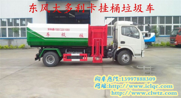 四、東風(fēng)大多利卡掛桶垃圾車,整車型號為CLW5080ZZZT5,底盤型號EQ1082GLJ2,總質(zhì)量8250kg,整備質(zhì)量4330kg,額定質(zhì)量3725kg,3300mm軸距,朝柴151馬力國五發(fā)動機(jī),7.50-16LT輪胎。該款掛桶垃圾車屬于自裝卸式垃圾車,側(cè)面帶掛桶提升機(jī)構(gòu),垃圾桶可選擇120L或240L的鐵桶或塑料桶。