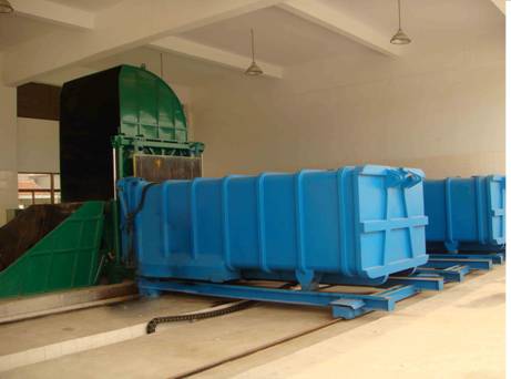 將垃圾倒入壓縮機(jī)的提料斗內(nèi),利用壓縮機(jī)的推料裝置將垃圾推入水平放置的箱體內(nèi)(箱體一般為長(zhǎng)方體集裝箱),推料裝置可不斷地向箱體內(nèi)壓垃圾,直到箱體壓滿為止,然后由車廂可卸式垃圾車(拉臂車)將箱體運(yùn)到填埋場(chǎng)或焚燒場(chǎng),