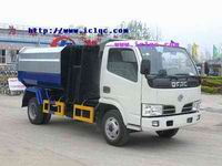 自裝料裝置:自裝料裝置設(shè)在貨廂的前部側(cè)面,由支架、油缸、鏈條機(jī)構(gòu)、吊鉤等組成。使用此裝置可將外部圾桶內(nèi)的垃圾提升裝入貨廂內(nèi)。